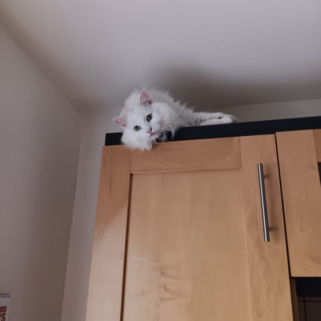 โSnowflake decided the top of the kitchen cupboard is his personal penthouse suite. Not exactly what I had in mind when I said โcat zoneโโฆ but hey, heโs happy!โ