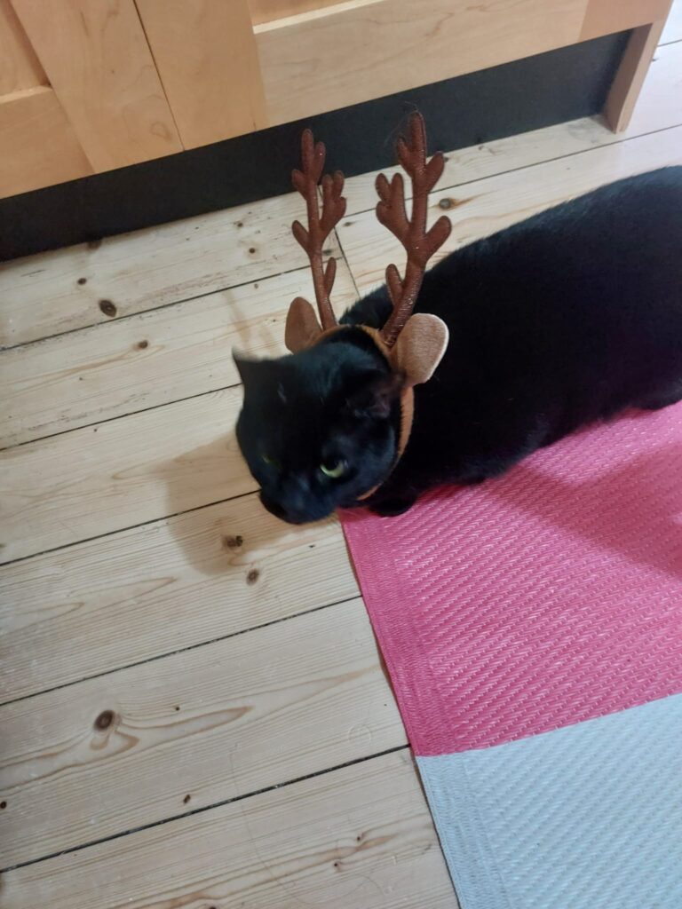 When Twilight strutted into the living room wearing her reindeer antlers, she didn’t just walk—she owned the runway. One flick of her tail and that look in her golden eyes said it all: “Yes, darling. I am the moment.”